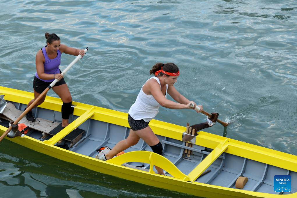 Elena Almansi, member of "Row Venice," practices with her teammate for the Regata Storica boat race in Venice, Italy, Sept. 4, 2025.(Xinhua/Li Jing)
