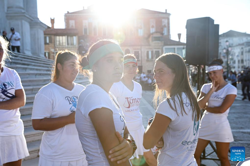 Members of "Row Venice" attend a rehearsal of the Regata Storica boat race in Venice, Italy, Sept. 4, 2025.(Xinhua/Li Jing)