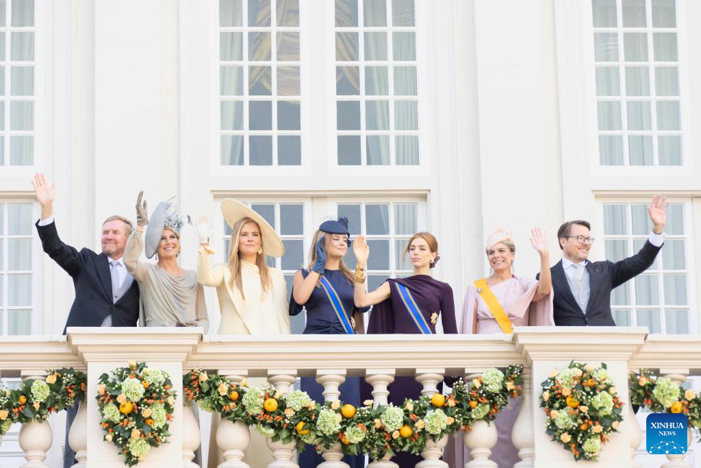 Dutch King Willem-Alexander, Queen Maxima, Princess Amalia, Princess Ariane, Princess Alexia, Princess Laurentien and Prince Constantijn (from L to R) wave to people on the balcony of Noordeinde Palace on Prinsjesdag, or Prince's Day, in The Hague, the Netherlands, Sept. 16, 2025. The third Tuesday of September is the Prince's Day in the Netherlands, which marks the opening of the Dutch parliamentary season, and on this day the reigning monarch outlines the government's plans for the year ahead. (Photo by Sylvia Lederer/Xinhua)