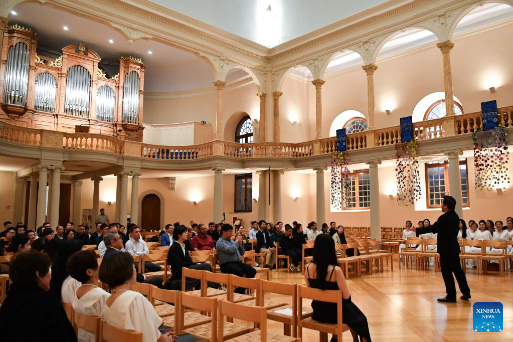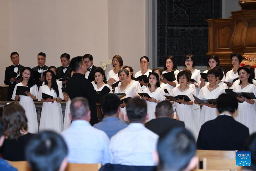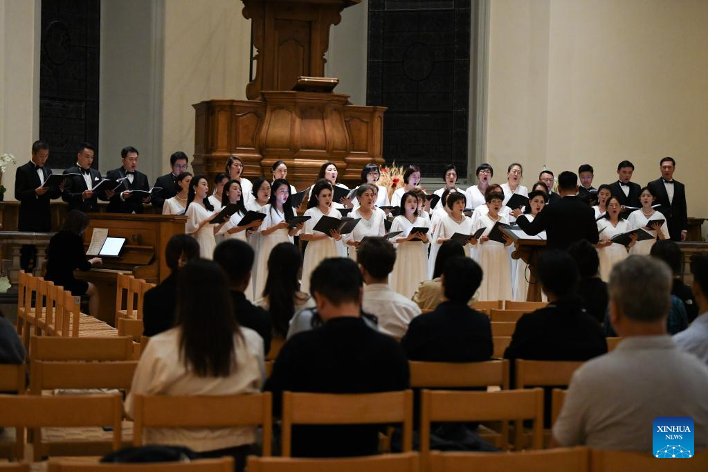 The "Voices of Peace" concert by choirs from China is staged in Morges, Switzerland, Sept. 17, 2025. The concert enchanted an audience including guests from Switzerland, France, Italy, as well as members of the local Chinese community. (Xinhua/Lian Yi)