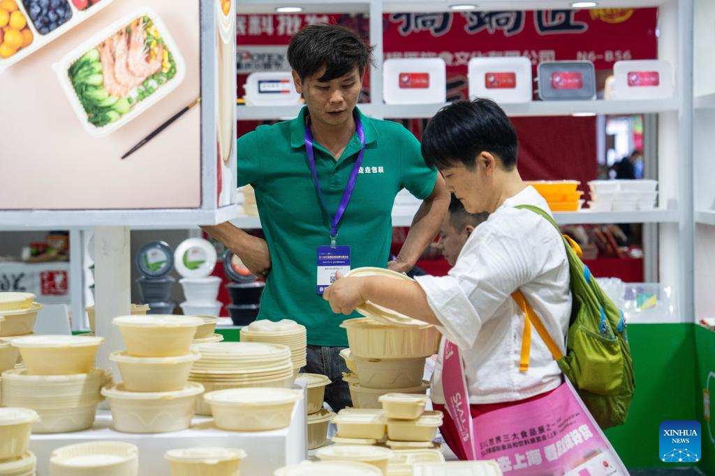A visitor (R) learns about a disposable lunch box at the 10th China International Food & Catering Expo in Changsha, central China's Hunan Province, Sept. 19, 2025. The 10th China International Food & Catering Expo opened here on Friday, attracting over 1,400 enterprises to participate. (Xinhua/Chen Sihan)