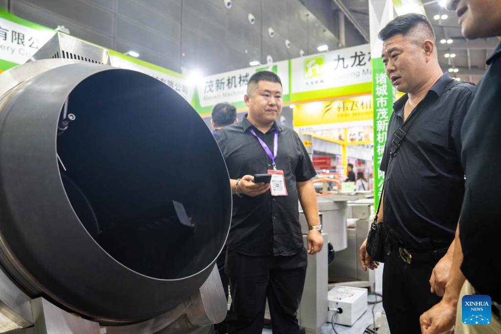 A visitor (R) learns about a commercial cooking machine at the 10th China International Food & Catering Expo in Changsha, central China's Hunan Province, Sept. 19, 2025. The 10th China International Food & Catering Expo opened here on Friday, attracting over 1,400 enterprises to participate. (Xinhua/Chen Sihan)