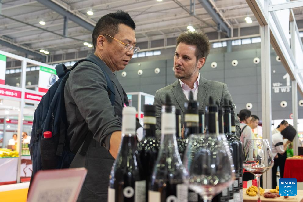An exhibitor (R) introduces wine to a visitor at the 10th China International Food & Catering Expo in Changsha, central China's Hunan Province, Sept. 19, 2025. The 10th China International Food & Catering Expo opened here on Friday, attracting over 1,400 enterprises to participate. (Xinhua/Chen Sihan)