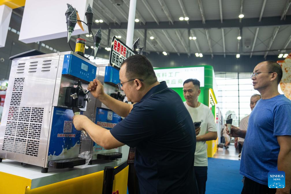 Visitors taste an ice cream at the 10th China International Food & Catering Expo in Changsha, central China's Hunan Province, Sept. 19, 2025. The 10th China International Food & Catering Expo opened here on Friday, attracting over 1,400 enterprises to participate. (Xinhua/Chen Sihan)