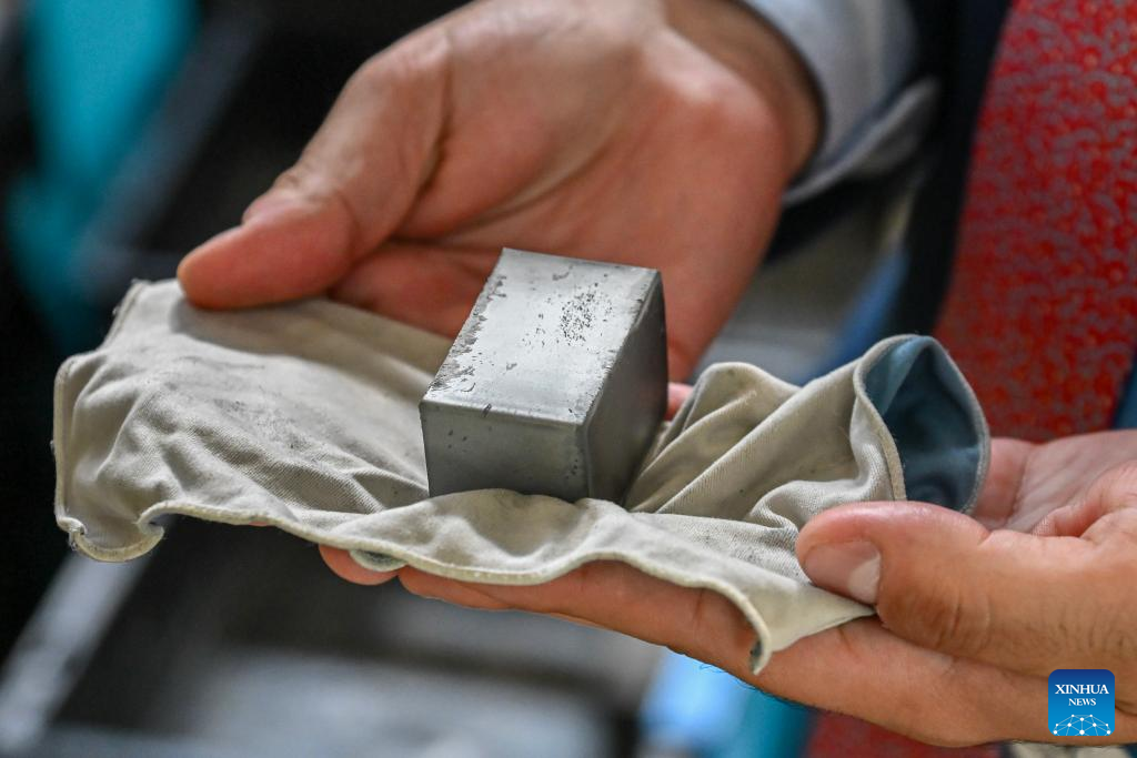 Photo taken on Sept. 19, 2025 shows a rare-earth magnetic bar at NEO magnetic plant in Narva, a city in northeastern Estonia. A plant producing rare-earth magnets for Europe's electric vehicle and wind-energy sectors opened Friday in Narva, Estonia. (Photo by Sergei Stepanov/Xinhua)