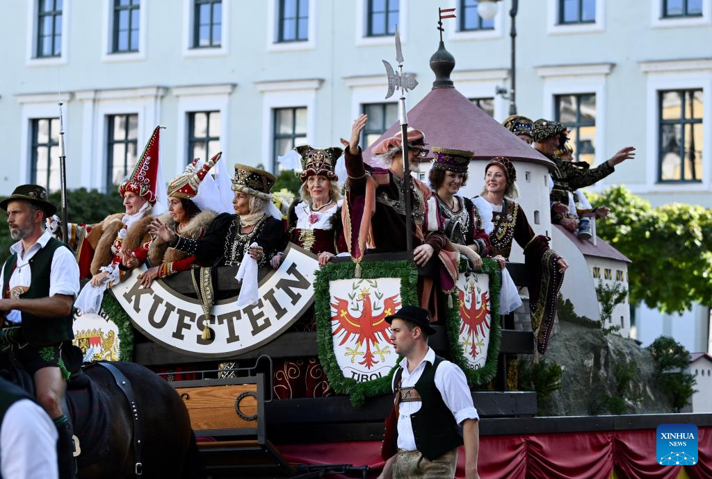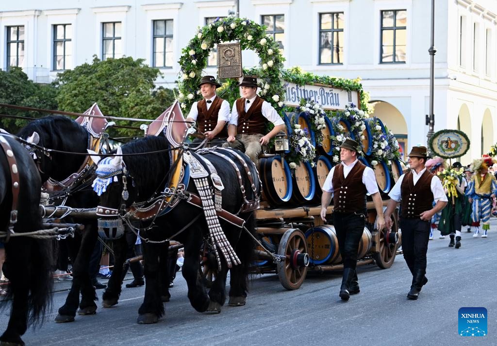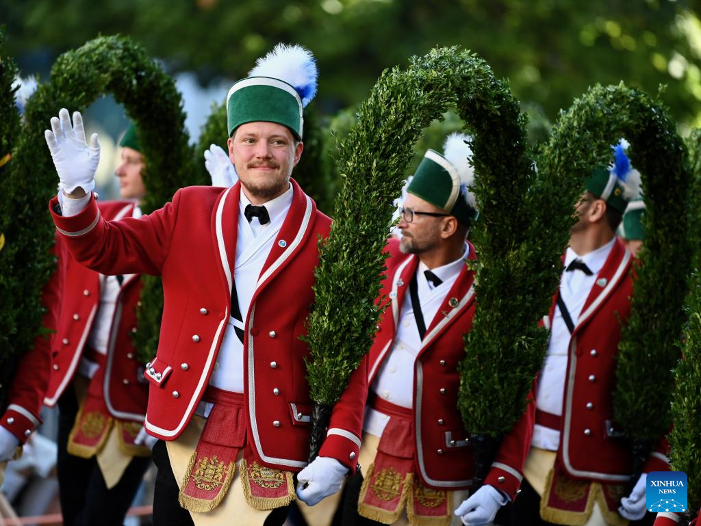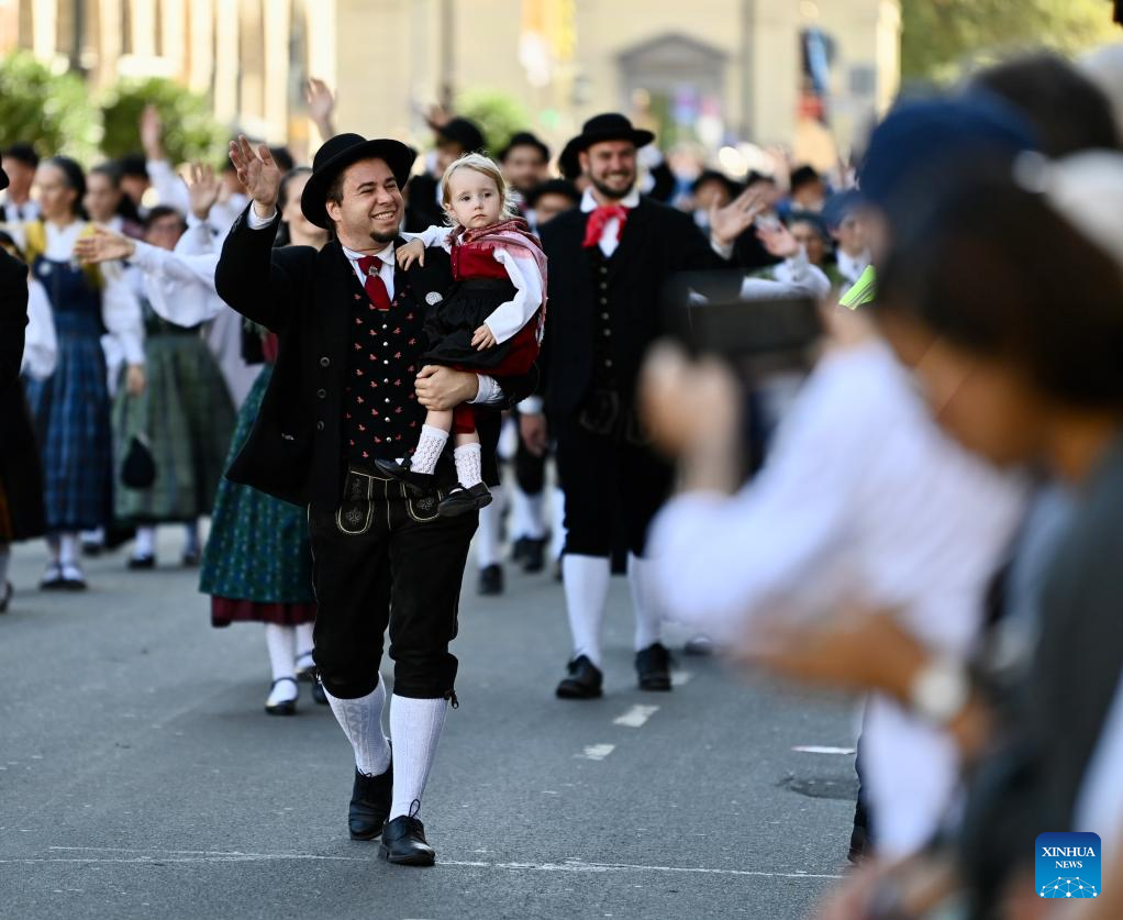 People participate in the Oktoberfest parade in Munich, Germany, Sept. 21, 2025. The 190th Oktoberfest, one of the largest folk festivals in Germany, opened on Saturday in Munich, with mayor Dieter Reiter tapping the first barrel of beer as a tradition. This year's festival will last until Oct. 5. (Xinhua/Zhang Haofu)
