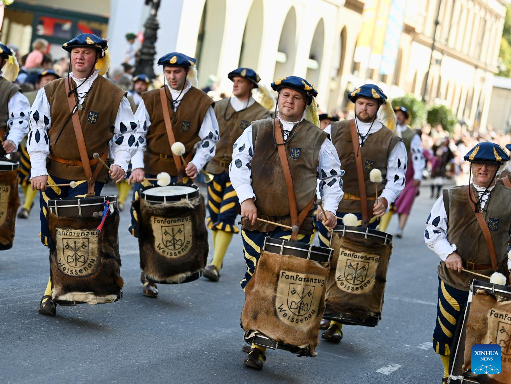 Musicians participate in the Oktoberfest parade in Munich, Germany, Sept. 21, 2025. The 190th Oktoberfest, one of the largest folk festivals in Germany, opened on Saturday in Munich, with mayor Dieter Reiter tapping the first barrel of beer as a tradition. This year's festival will last until Oct. 5. (Xinhua/Zhang Haofu)