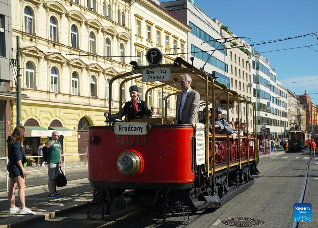 People take a historical tram during a tram parade in Prague, the Czech Republic, on Sept. 21, 2025. A tram parade was held here on Sunday as part of the celebrations to mark 150 years of urban public transport in the Czech capital. (Photo by Dana Kesnerova/Xinhua)