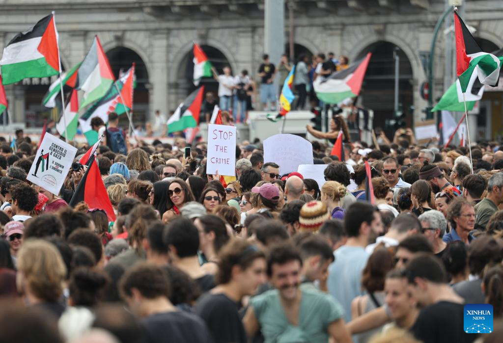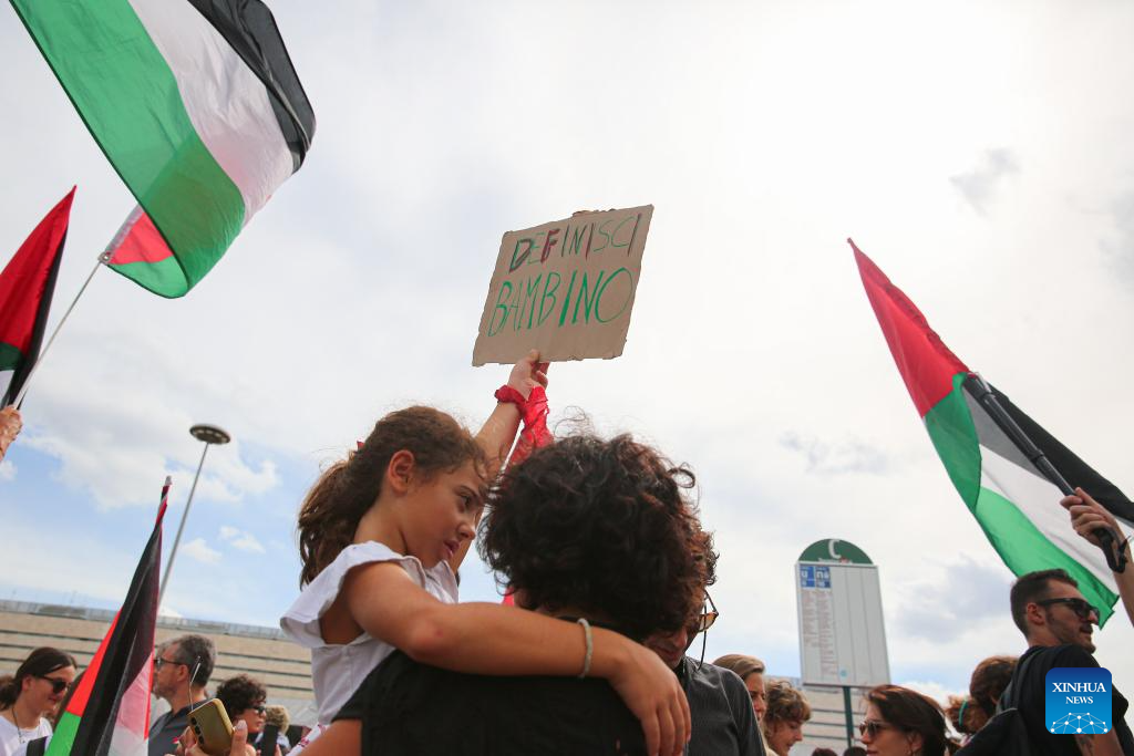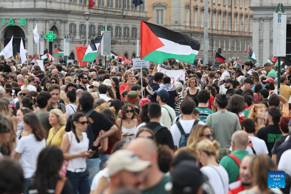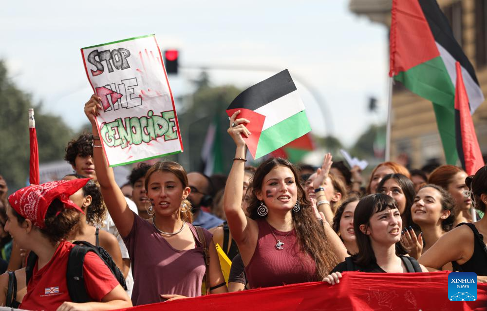 People participate in a pro-Palestinian protest in Rome, Italy, on Sept. 22, 2025. (Xinhua/Li Jing)