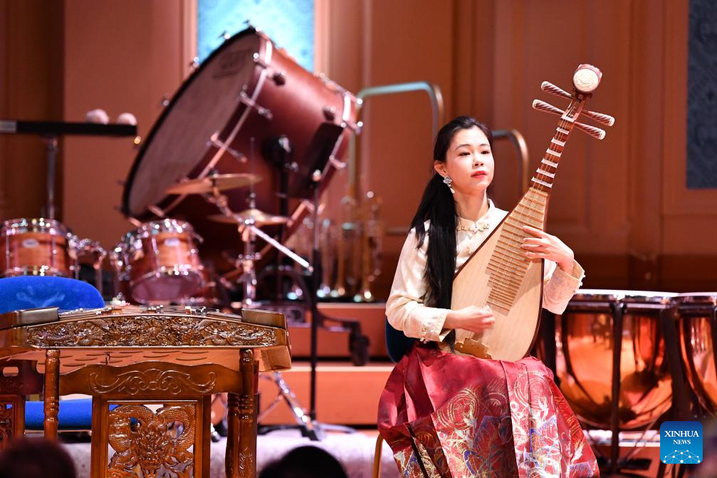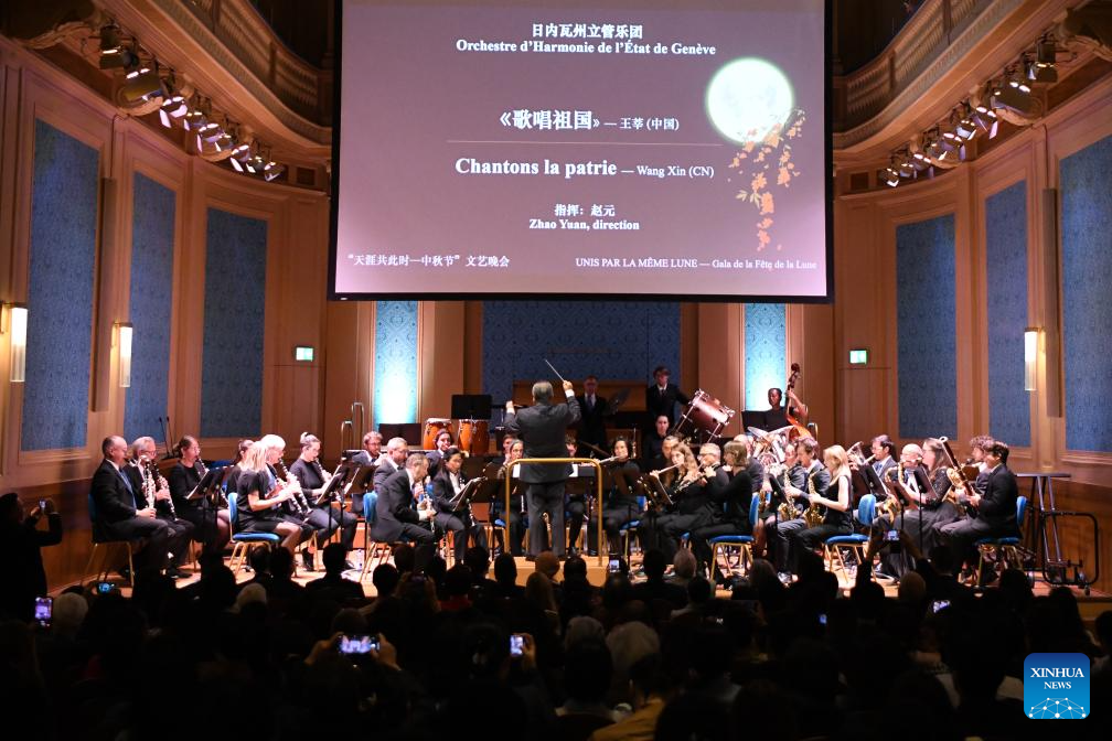 The event featured performances staged by the Hangzhou Opera and Dance Drama Theater's "Xizi's National Music" and the Geneva State Wind Orchestra. (Xinhua/Lian Yi)