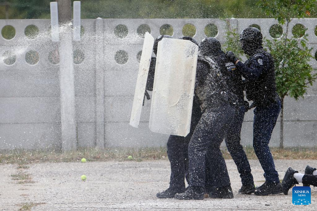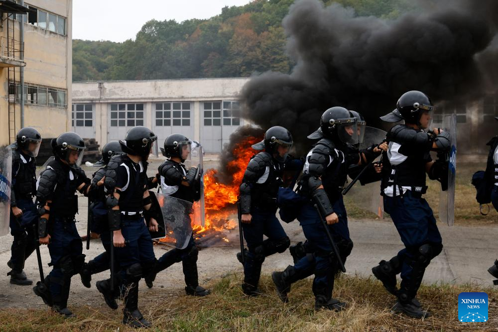 Romanian riot policemen participate at the "Carpathian Blue Shield 2025" international exercise at the Gendarmerie Training Center in Ochiuri village, north of Bucharest, Romania, Sept. 25, 2025. Over 500 riot policemen from Romania and other European countries participated at the drill. (Photo by Cristian Cristel/Xinhua)