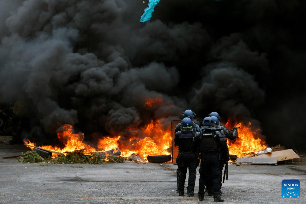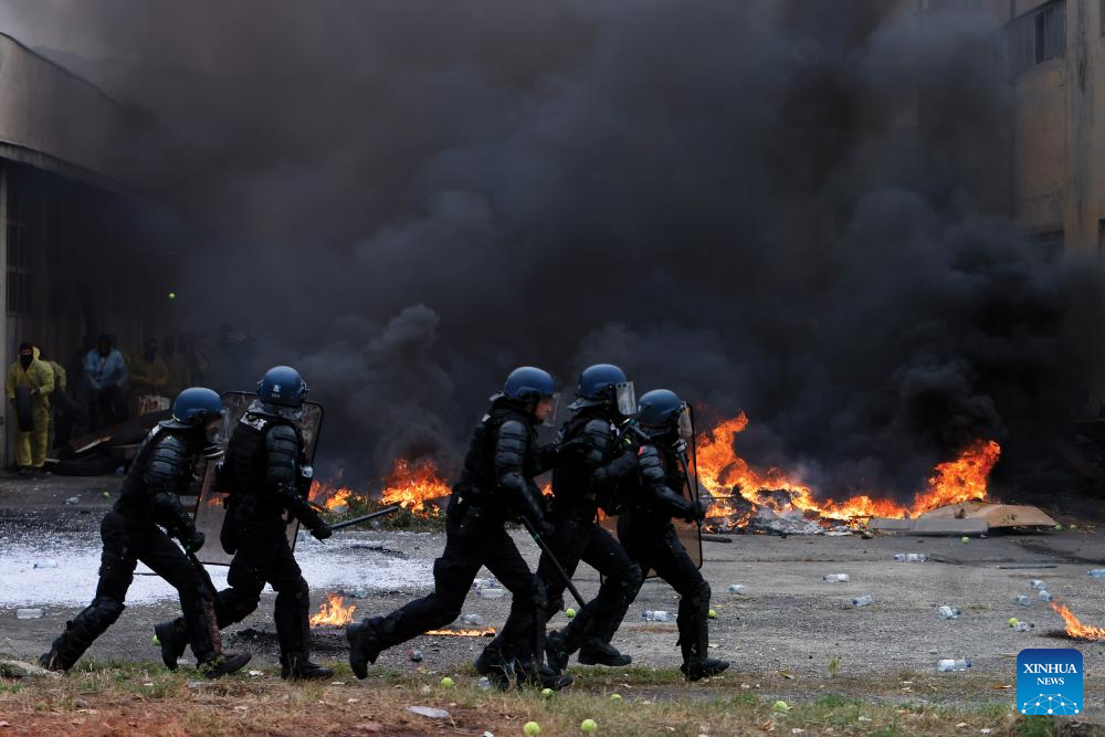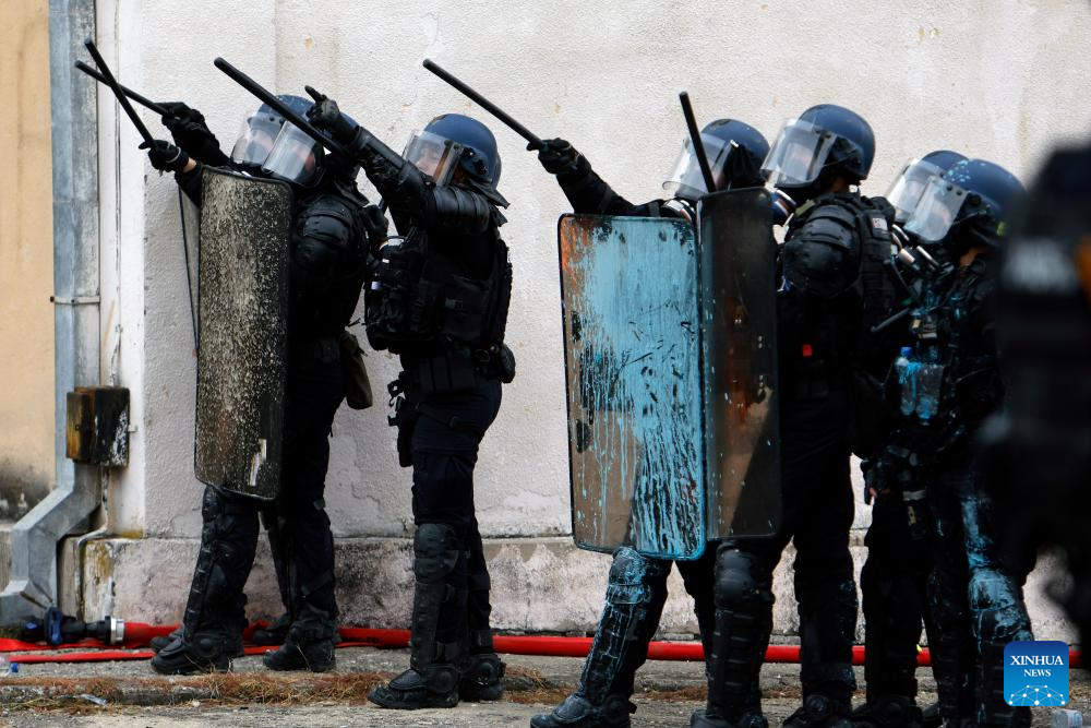 French riot policemen participate at the "Carpathian Blue Shield 2025" international exercise at the Gendarmerie Training Center in Ochiuri village, north of Bucharest, Romania, Sept. 25, 2025. Over 500 riot policemen from Romania and other European countries participated at the drill. (Photo by Cristian Cristel/Xinhua)