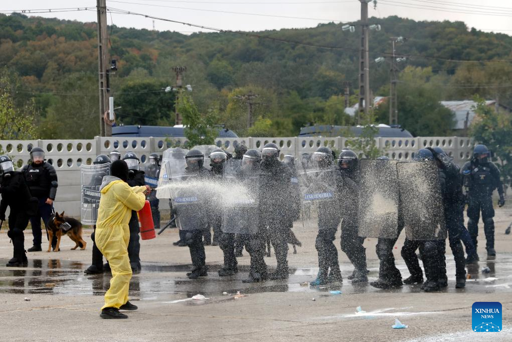 A fake protester confronts with Romanian riot policemen during the "Carpathian Blue Shield 2025" international exercise at the Gendarmerie Training Center in Ochiuri village, north of Bucharest, Romania, Sept. 25, 2025. Over 500 riot policemen from Romania and other European countries participated at the drill. (Photo by Cristian Cristel/Xinhua)