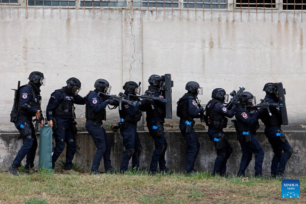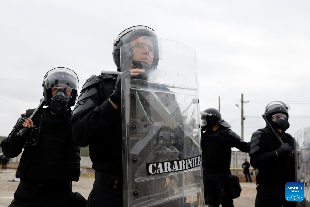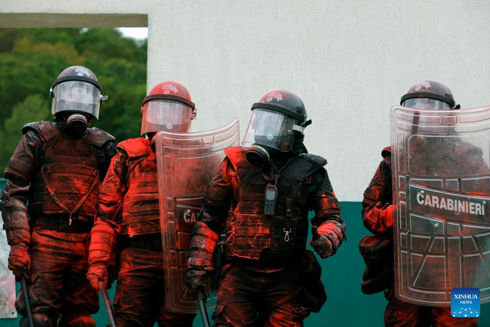 Italian riot policemen participate at the "Carpathian Blue Shield 2025" international exercise at the Gendarmerie Training Center in Ochiuri village, north of Bucharest, Romania, Sept. 25, 2025. Over 500 riot policemen from Romania and other European countries participated at the drill. (Photo by Cristian Cristel/Xinhua)