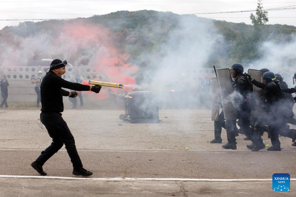 A fake protester sprays fire extinguisher foam in front of Romanian riot policemen participating at the "Carpathian Blue Shield 2025" international exercise at the Gendarmerie Training Center in Ochiuri village, north of Bucharest, Romania, Sept. 25, 2025. Over 500 riot policemen from Romania and other European countries participated at the drill. (Photo by Cristian Cristel/Xinhua)