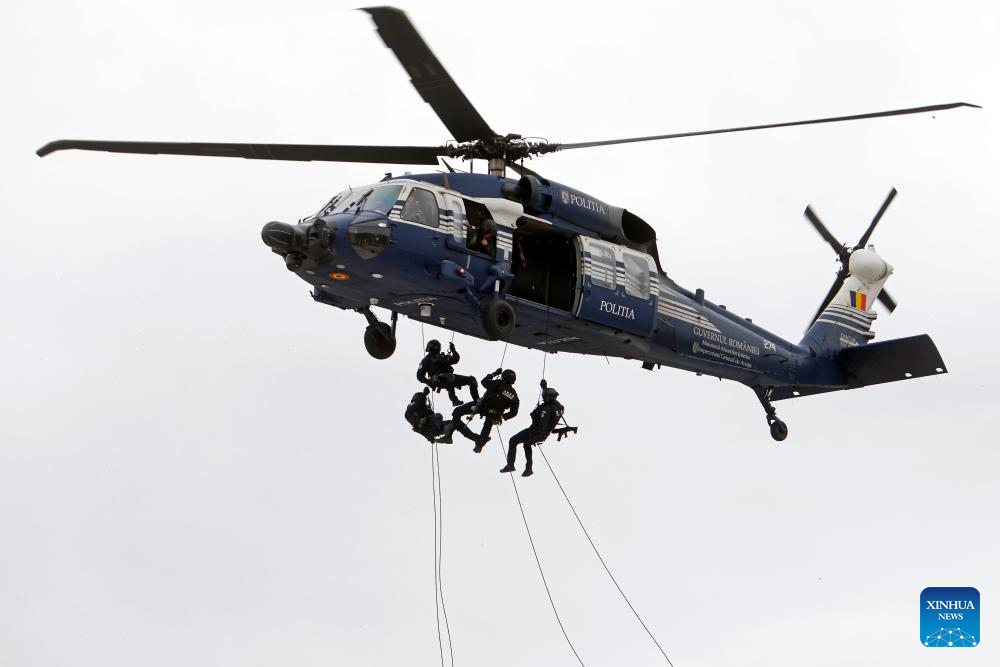 Romanian riot policemen descend from a helicopter during the "Carpathian Blue Shield 2025" international exercise at the Gendarmerie Training Center in Ochiuri village, north of Bucharest, Romania, Sept. 25, 2025. Over 500 riot policemen from Romania and other European countries participated at the drill. (Photo by Cristian Cristel/Xinhua)