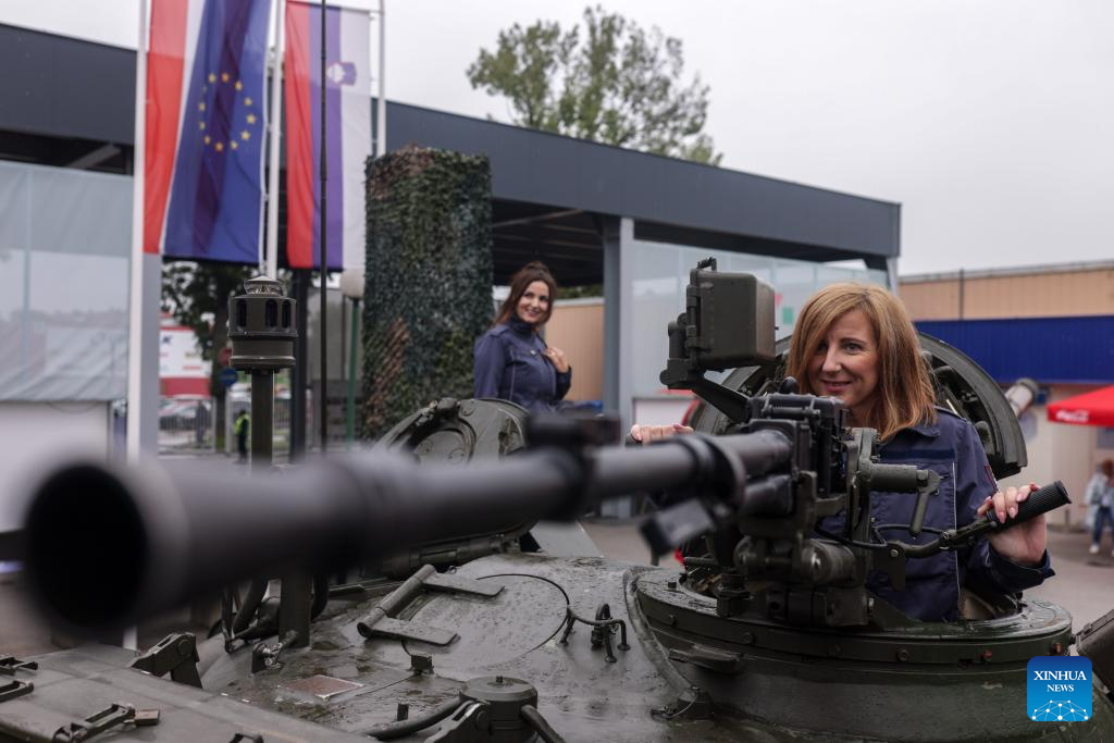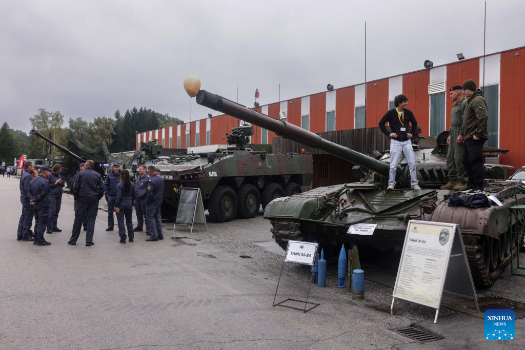 Heavy weaponry and armored vehicles are on display during the 10th International Fair of Defense, Security, Protection and Rescue in Gornja Radgona, Slovenia, Sept. 26, 2025. (Photo by Zeljko Stevanic/Xinhua)