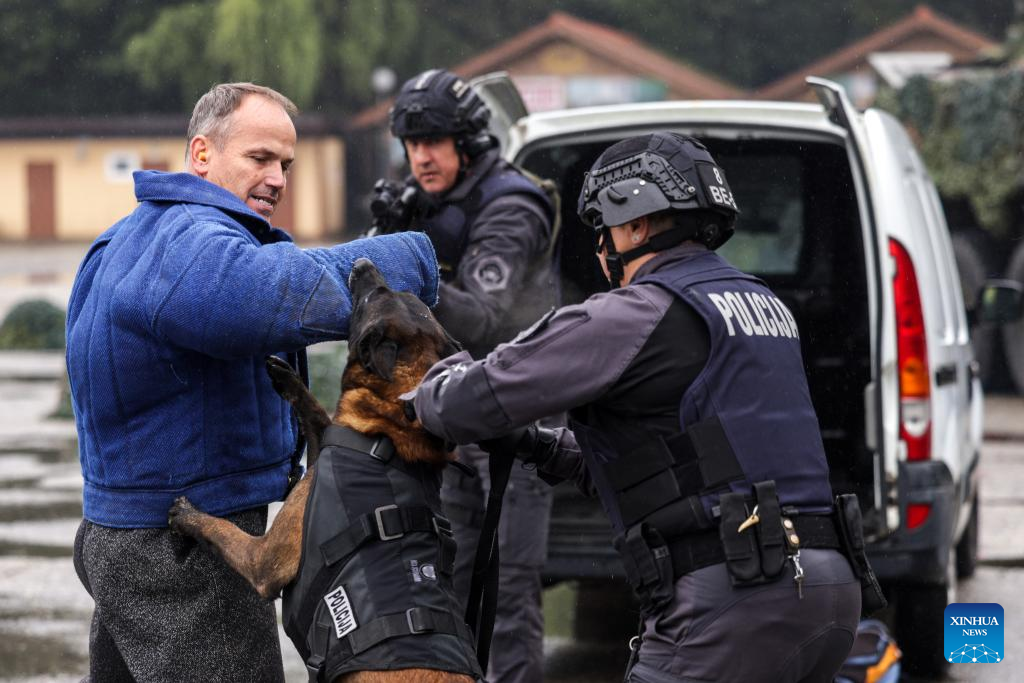 Members of the police special forces demonstrate the arrest of an armed drug dealer with the help of a trained police dog during the 10th International Fair of Defense, Security, Protection and Rescue in Gornja Radgona, Slovenia, Sept. 26, 2025. (Photo by Zeljko Stevanic/Xinhua)