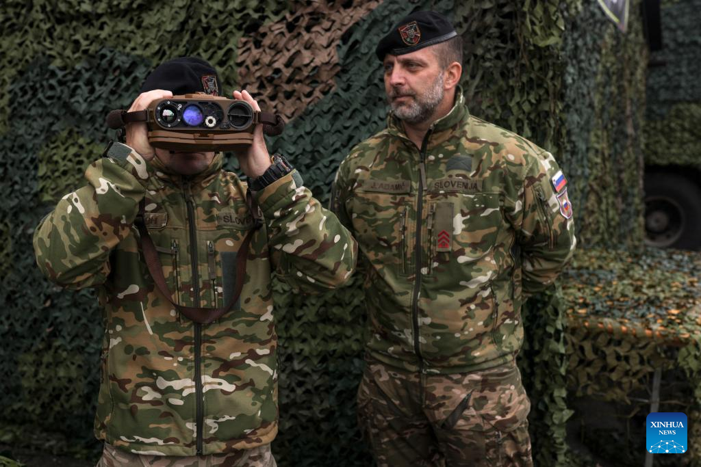 A soldier demonstrates the use of multi-purpose artillery binoculars during the 10th International Fair of Defense, Security, Protection and Rescue in Gornja Radgona, Slovenia, Sept. 26, 2025. (Photo by Zeljko Stevanic/Xinhua)