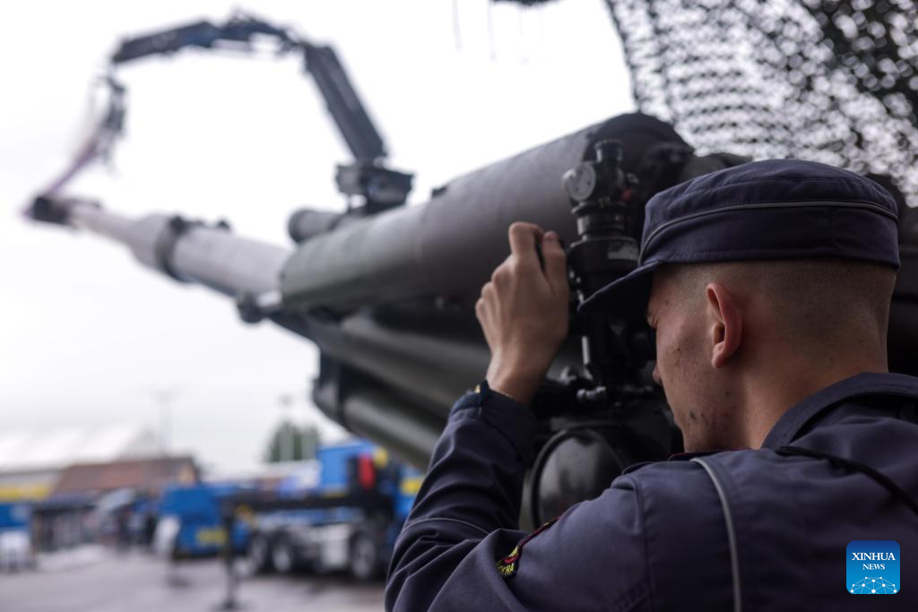 A visitor experiences the operation of a 155 mm canon during the 10th International Fair of Defense, Security, Protection and Rescue in Gornja Radgona, Slovenia, Sept. 26, 2025. (Photo by Zeljko Stevanic/Xinhua)