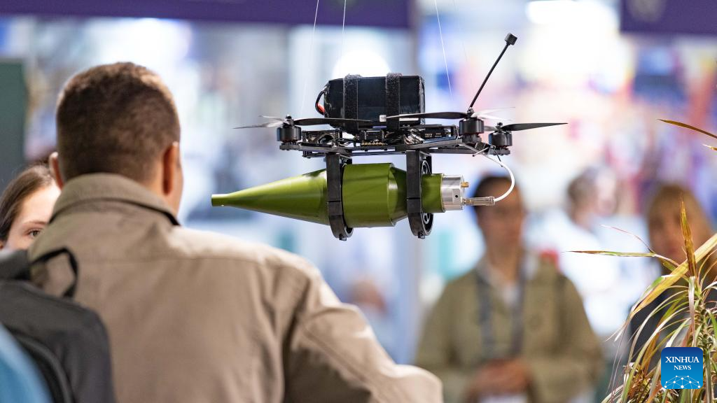 A technician introduces devices displayed at the 12th International Arms and Defense Equipment Fair "Partner 2025" in Belgrade, Serbia, Sept. 26, 2025. The 12th International Arms and Defense Equipment Fair "Partner 2025" was held from Sept. 23 to 26 in Belgrade this year, attracting a record 200 exhibitors from more than 30 countries and regions, including leading European and global defense companies, according to the Ministry of Defense.