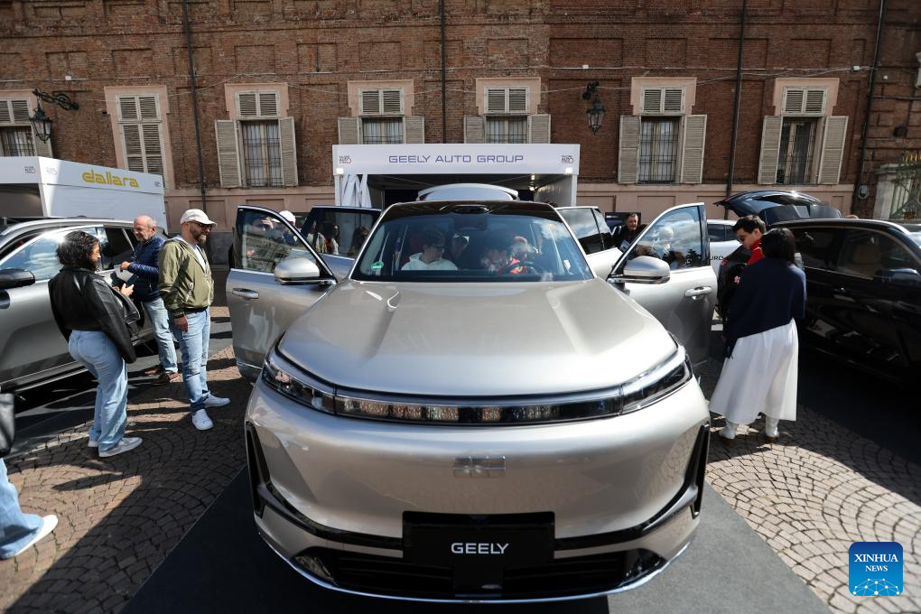 Visitors experience exhibit cars of Geely at Turin Auto Show in Turin, Italy, Sept. 27, 2025.