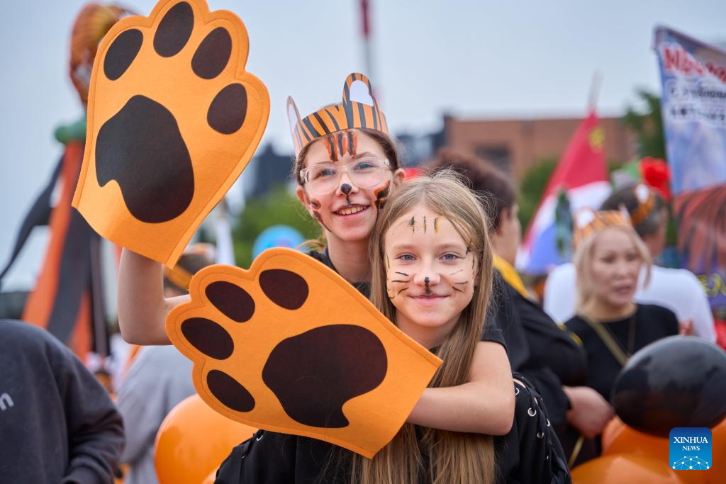 People participate in the Tiger Day costume parade in Vladivostok, Russia, Sept. 28, 2025. Since 2000, Vladivostok has celebrated Tiger Day in the last weekend of September each year to raise public awareness about tiger conservation. (Photo by Guo Feizhou/Xinhua)