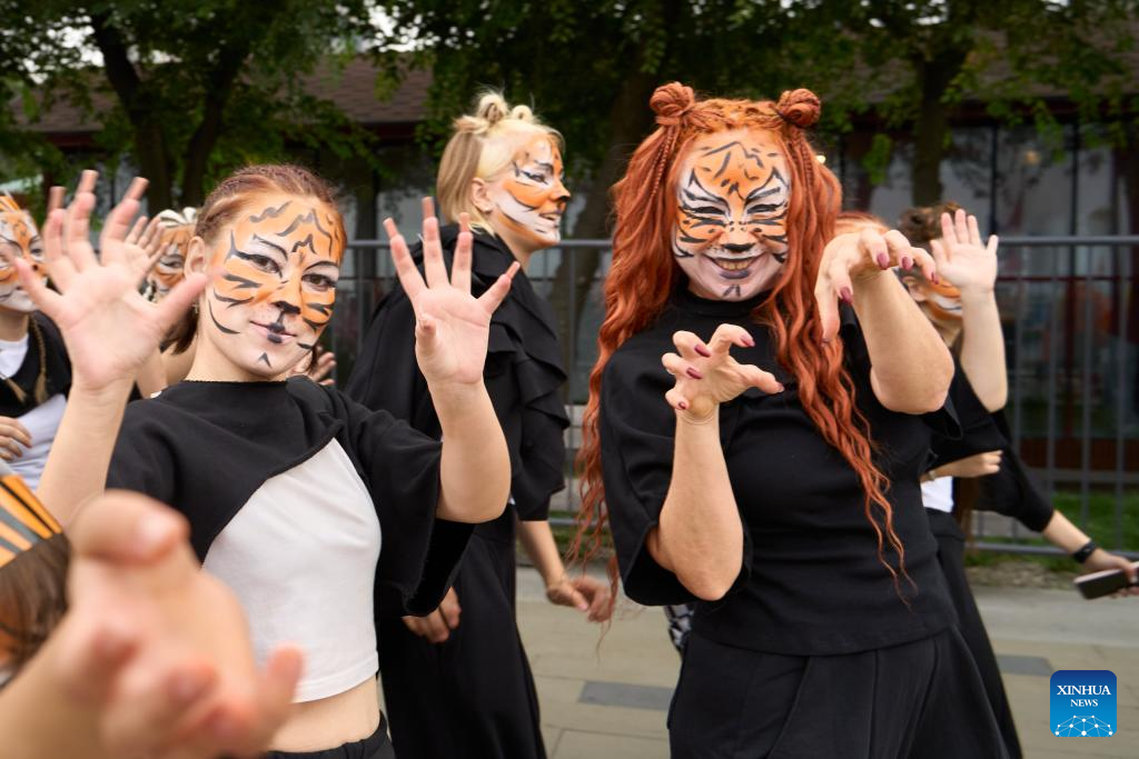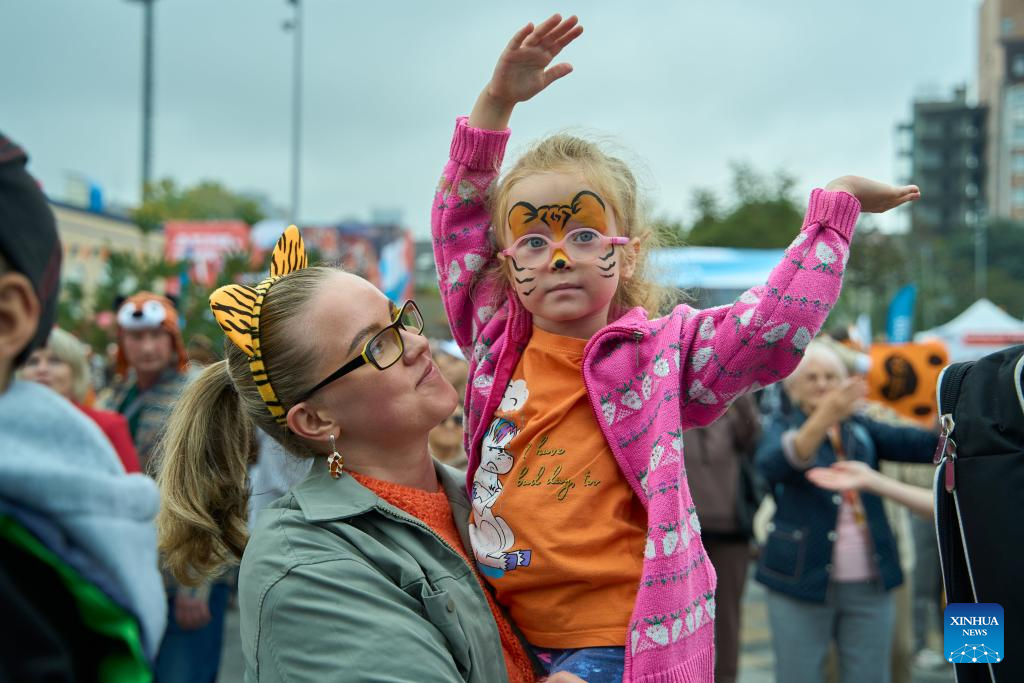 A girl dances during the Tiger Day event in Vladivostok, Russia, Sept. 28, 2025. Since 2000, Vladivostok has celebrated Tiger Day in the last weekend of September each year to raise public awareness about tiger conservation. (Photo by Guo Feizhou/Xinhua)