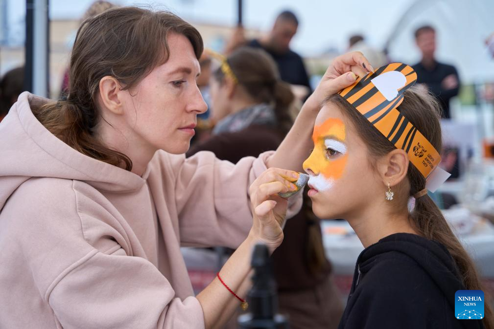 A girl gets make-up during the Tiger Day event in Vladivostok, Russia, Sept. 28, 2025. Since 2000, Vladivostok has celebrated Tiger Day in the last weekend of September each year to raise public awareness about tiger conservation. (Photo by Guo Feizhou/Xinhua)