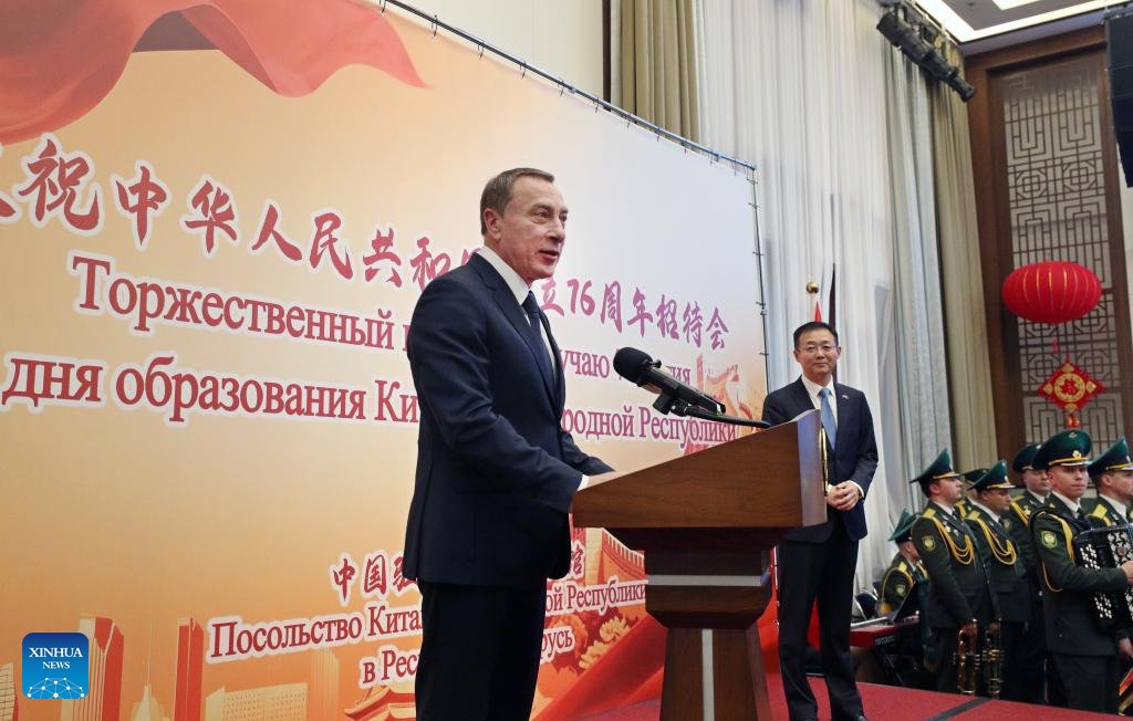 Belarusian First Deputy Prime Minister Nikolai Snopkov speaks at a reception hosted by the Chinese Embassy to celebrate the 76th anniversary of the founding of the People's Republic of China in Minsk, Belarus, Sept. 29, 2025.(Photo by Henadz Zhinkov/Xinhua)