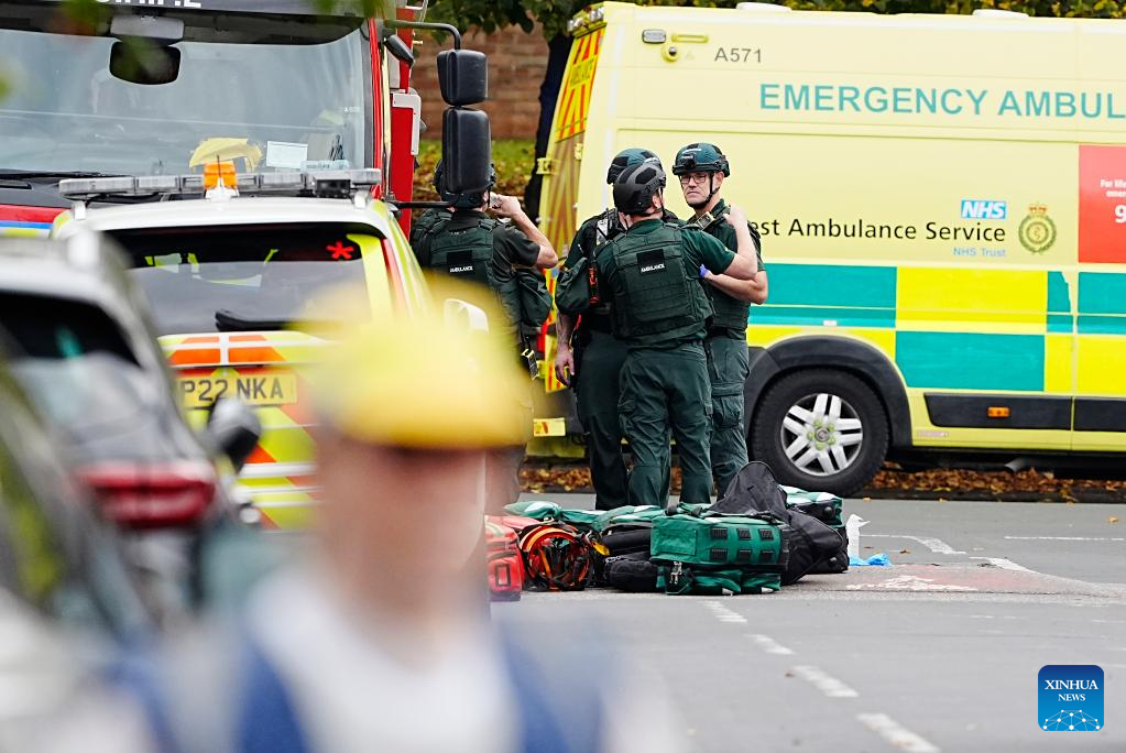 Emergency workers are pictured on the scene at Heaton Park Hebrew Congregation Synagogue in Manchester, Britain, Oct. 2, 2025. Police confirmed Thursday afternoon that the attack outside the Heaton Park Hebrew Congregation Synagogue on Middleton Road in Crumpsall, Manchester, has been declared a terrorist incident. (Xinhua)
