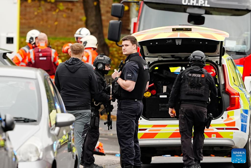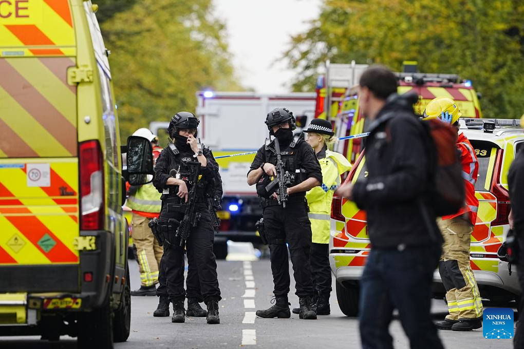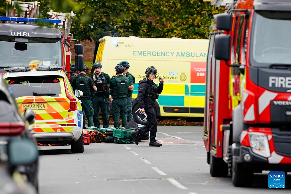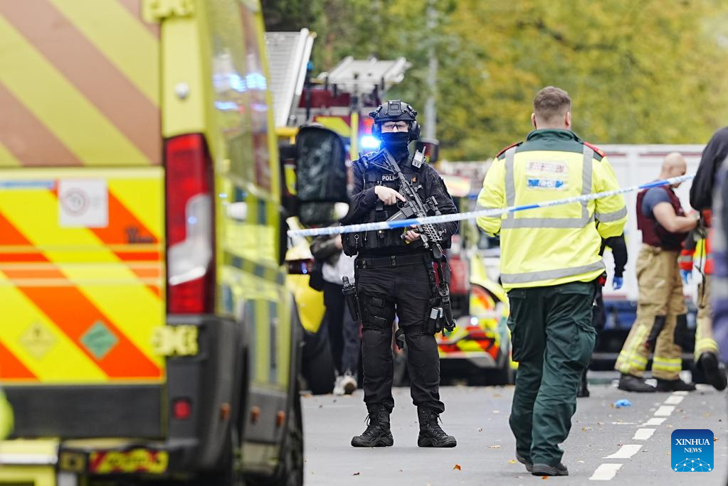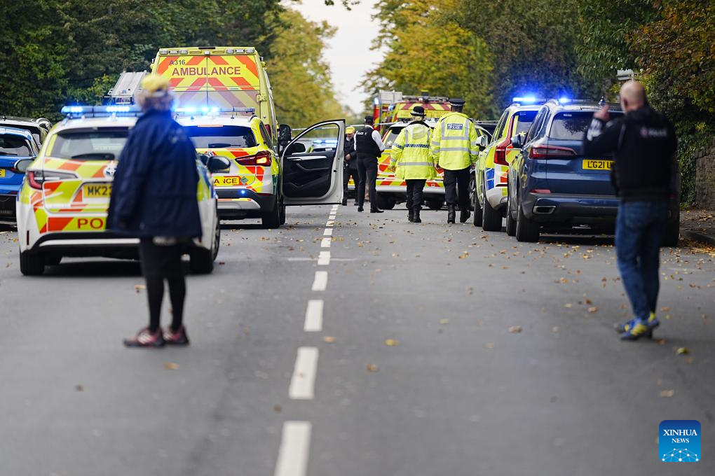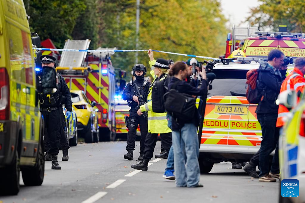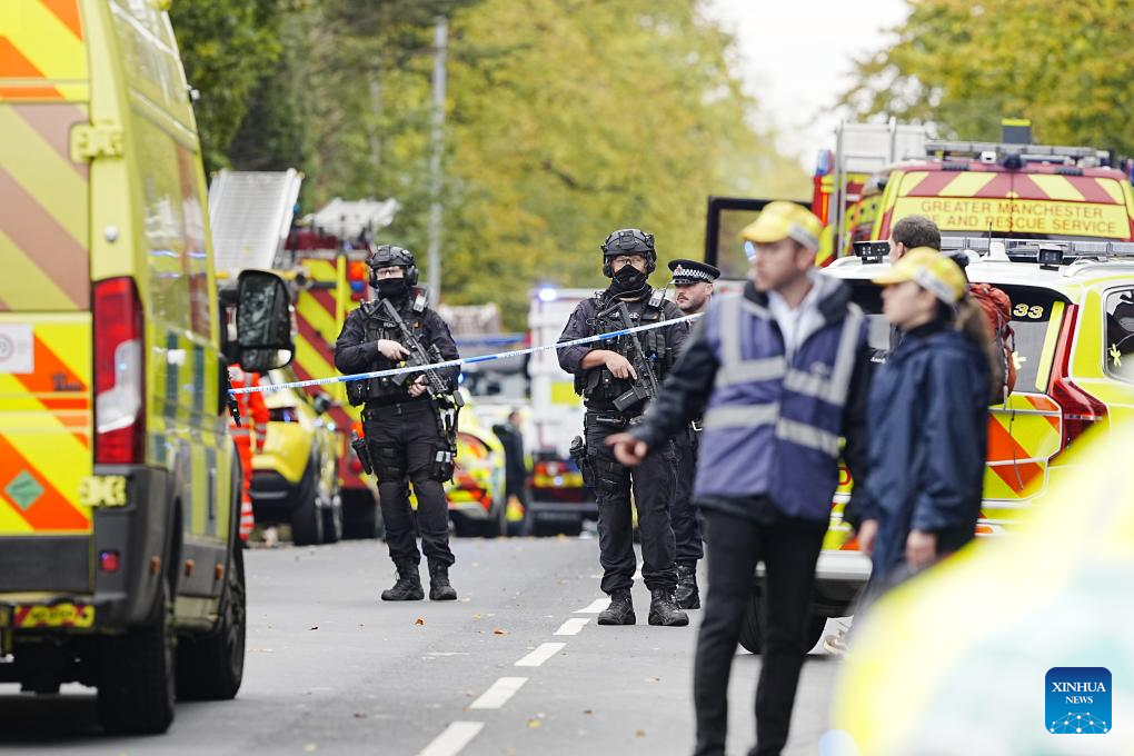Police officers and emergency services are pictured on the scene at Heaton Park Hebrew Congregation Synagogue in Manchester, Britain, Oct. 2, 2025. Police confirmed Thursday afternoon that the attack outside the Heaton Park Hebrew Congregation Synagogue on Middleton Road in Crumpsall, Manchester, has been declared a terrorist incident. (Xinhua)