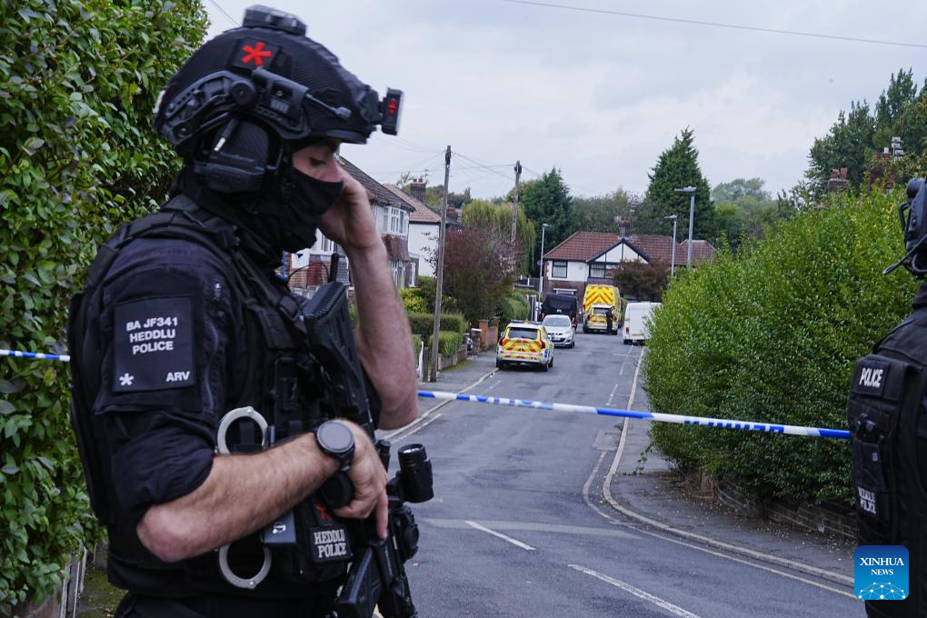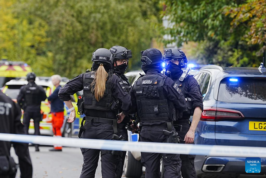 Police officers are pictured on the scene at Heaton Park Hebrew Congregation Synagogue in Manchester, Britain, Oct. 2, 2025. Police confirmed Thursday afternoon that the attack outside the Heaton Park Hebrew Congregation Synagogue on Middleton Road in Crumpsall, Manchester, has been declared a terrorist incident. (Xinhua)