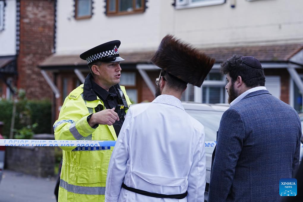 A police officer (L) is pictured on the scene at Heaton Park Hebrew Congregation Synagogue in Manchester, Britain, Oct. 2, 2025. Police confirmed Thursday afternoon that the attack outside the Heaton Park Hebrew Congregation Synagogue on Middleton Road in Crumpsall, Manchester, has been declared a terrorist incident. (Xinhua)