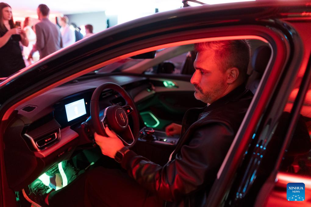 Visitors try a Hongqi vehicle at the opening ceremony of its first sales center in Ljubljana, Slovenia, Oct. 2, 2025. Chinese car brand Hongqi on Thursday opened its first sales center in Slovenia, in the capital Ljubljana. (Photo by Matej Pusnik/Xinhua)