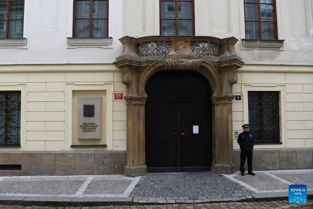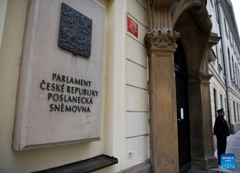 This photo taken on Oct. 4, 2025 shows the entrance of the Chamber of Deputies of the Parliament of the Czech Republic in Prague, capital of the Czech Republic.