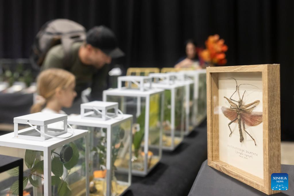 A Jungle Nymph specimen is displayed during the 31st Bioexo Exotic Animals Exhibition in Ljubljana, Slovenia, Oct. 3, 2025. (Photo by Zeljko Stevanic/Xinhua)