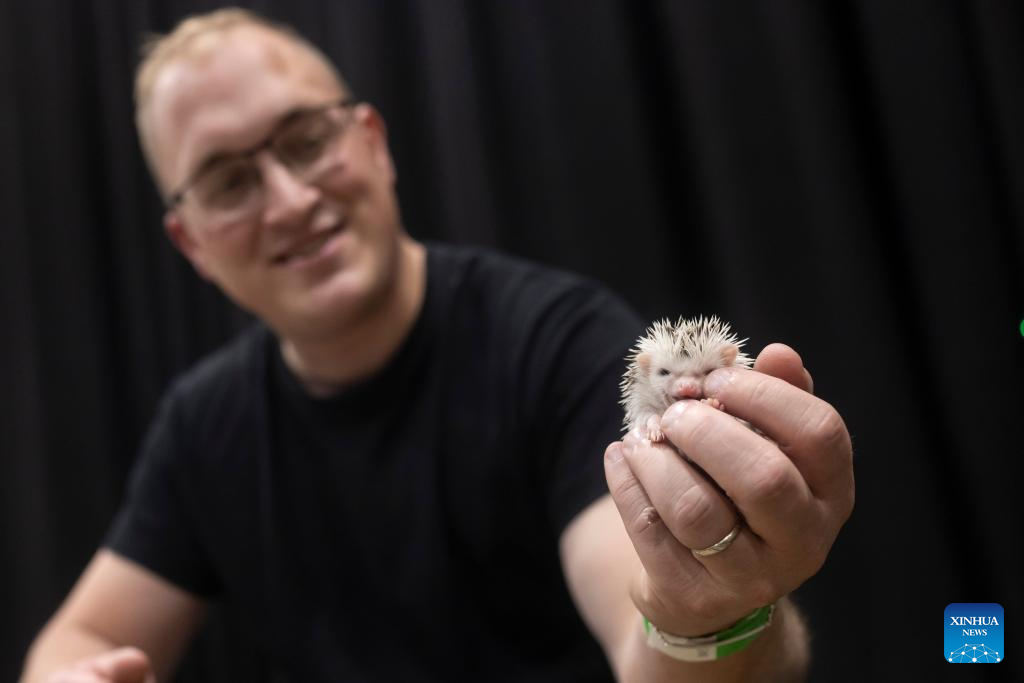 An exhibitor shows to visitors a cub of an African pygmy hedgehog during the 31st Bioexo Exotic Animals Exhibition in Ljubljana, Slovenia, Oct. 3, 2025. (Photo by Zeljko Stevanic/Xinhua)