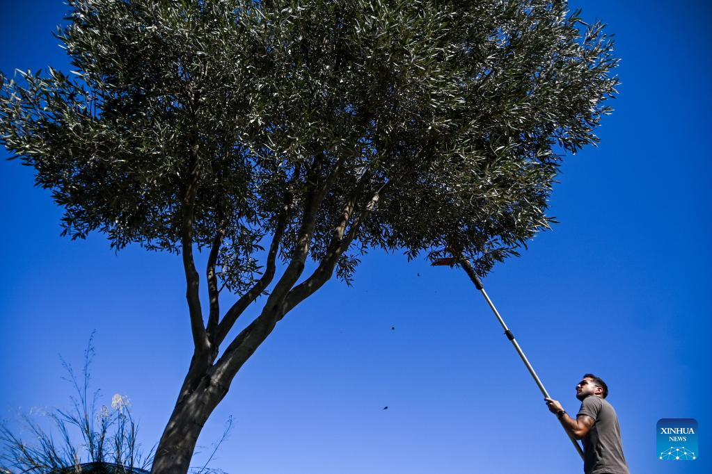 A man harvests olives in Zabbar, southeast Malta, Oct. 4, 2025. (Photo by Jonathan Borg/Xinhua)