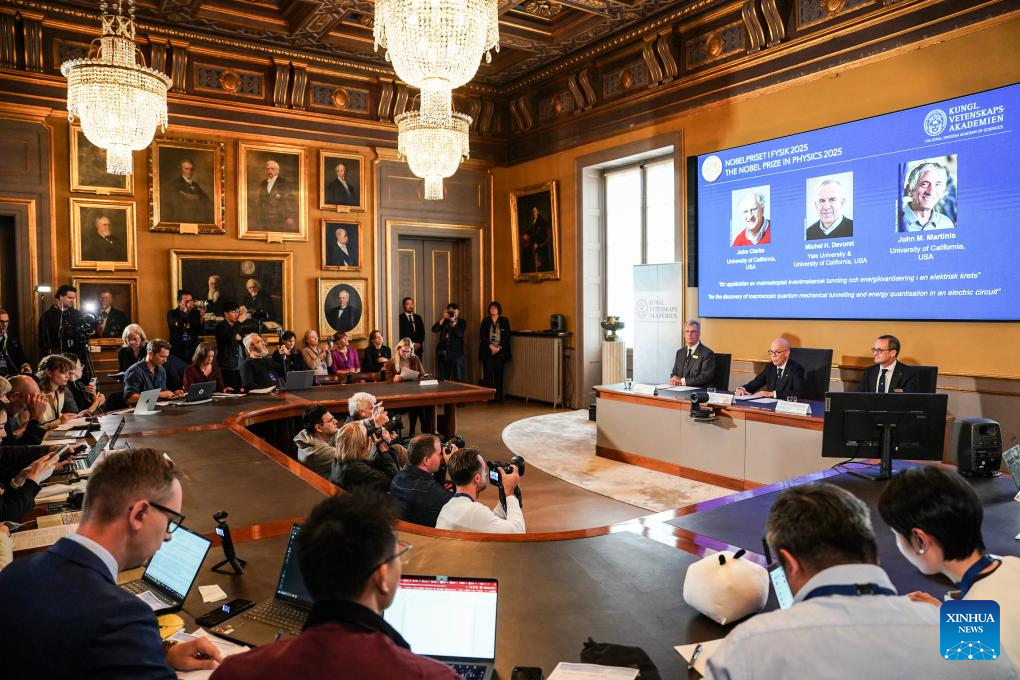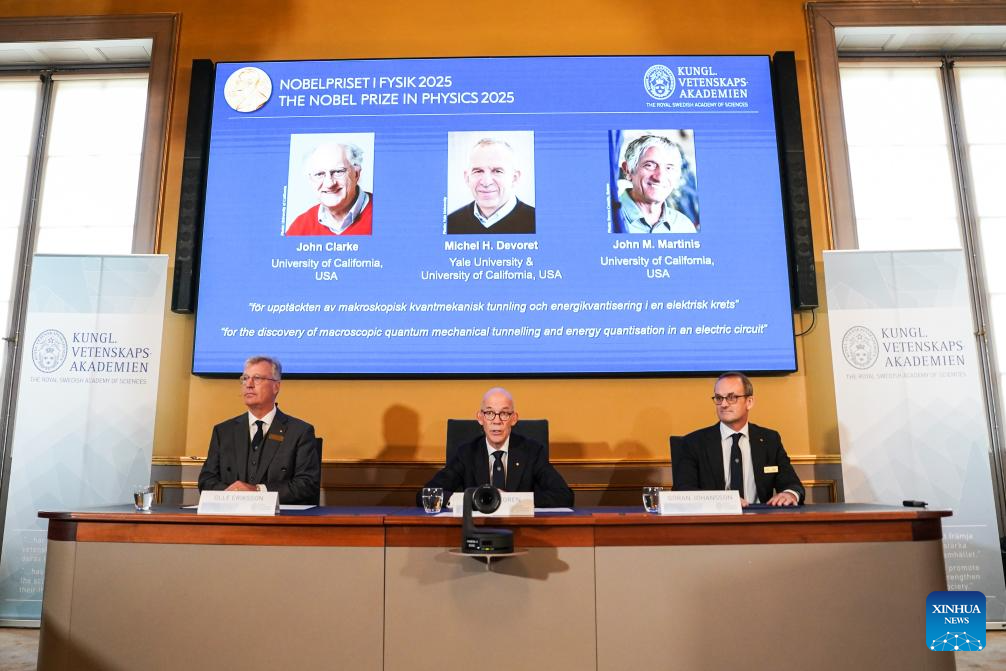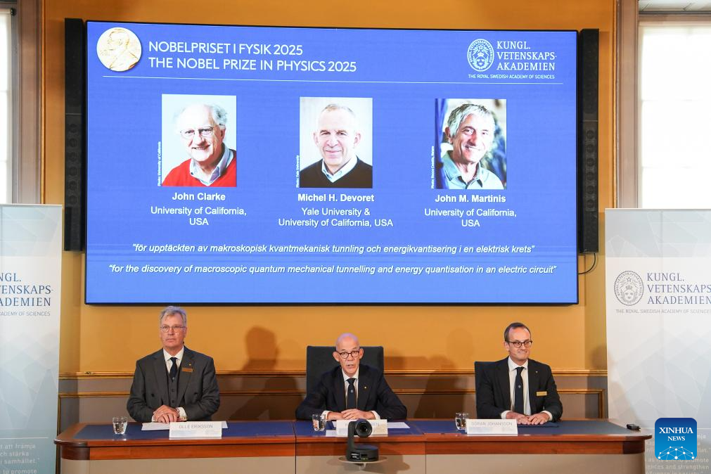 The 2025 Nobel Prize in Physics is announced in Stockholm, Sweden, Oct. 7, 2025. Three U.S.-based scientists, John Clarke, Michel H. Devoret and John M. Martinis, have been awarded the 2025 Nobel Prize in Physics for their discovery of macroscopic quantum mechanical tunnelling and energy quantisation in an electric circuit, the Royal Swedish Academy of Sciences announced on Tuesday. (Xinhua/Peng Ziyang)