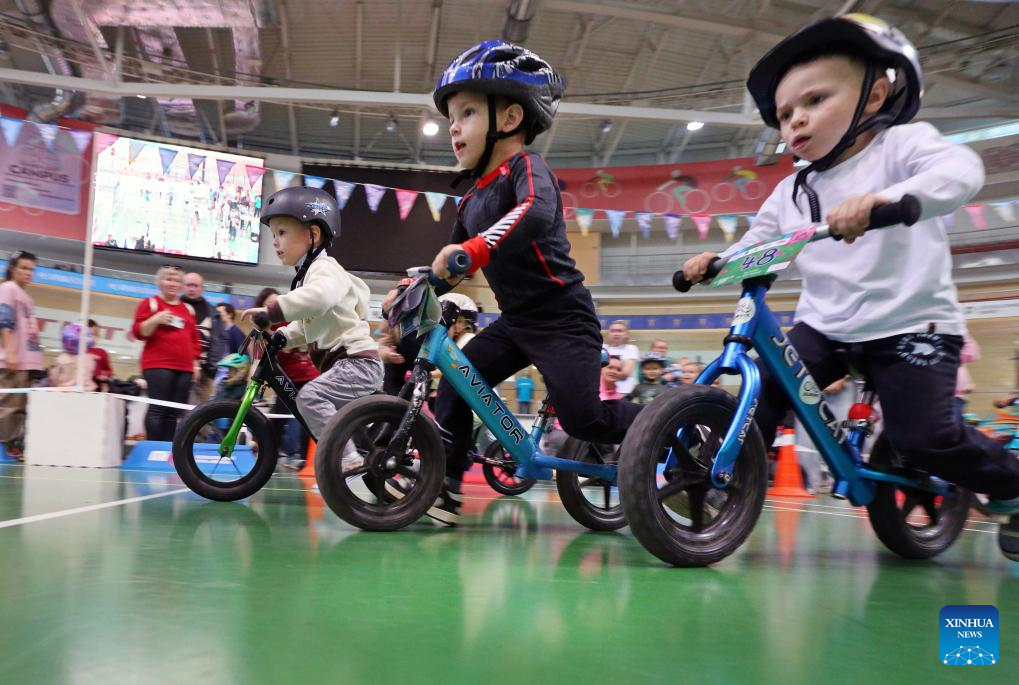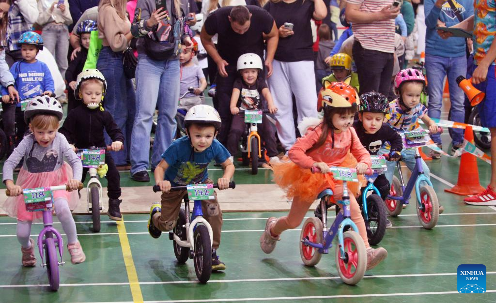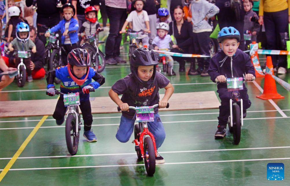 Kids compete in a balance bike race in Minsk, Belarus, Oct. 11, 2025. (Photo by Henadz Zhinkov/Xinhua)