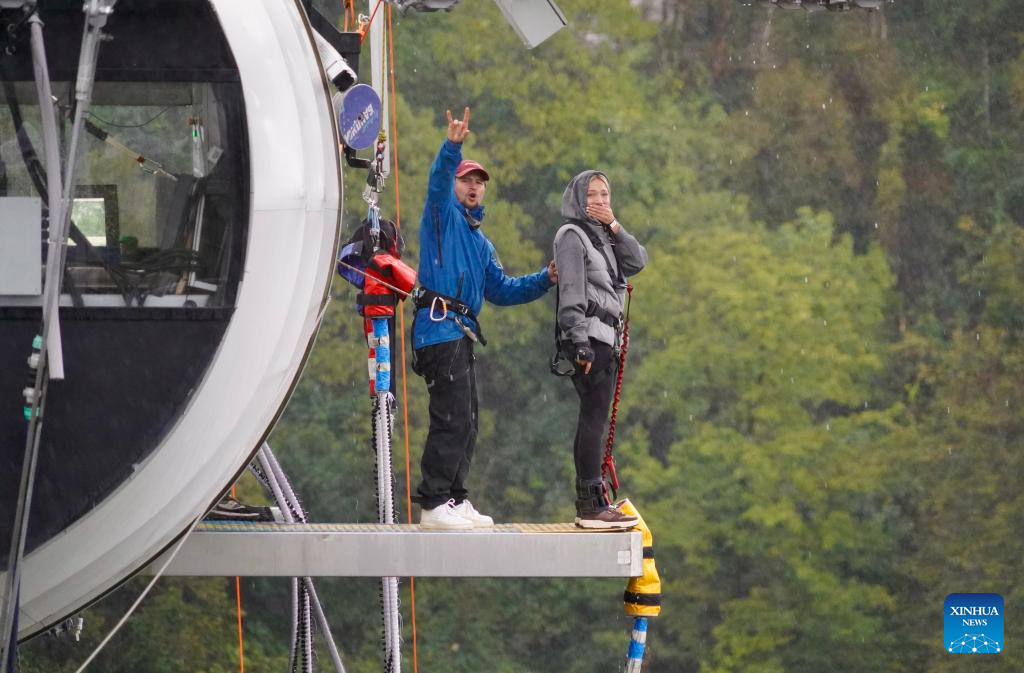 A tourist prepares to bungee jump at the Skypark walkway in Sochi, Russia, Oct. 12, 2025.