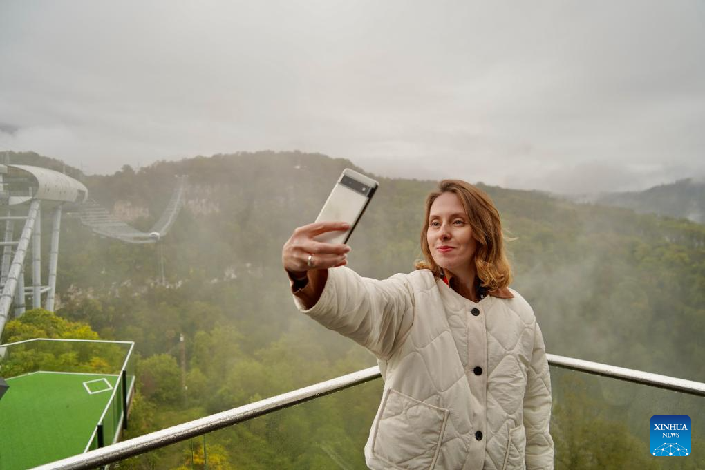 A tourist takes selfies at the Skypark walkway in Sochi, Russia, Oct. 12, 2025.