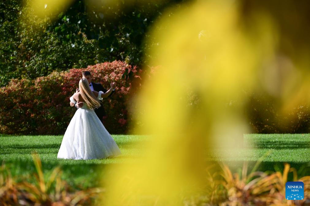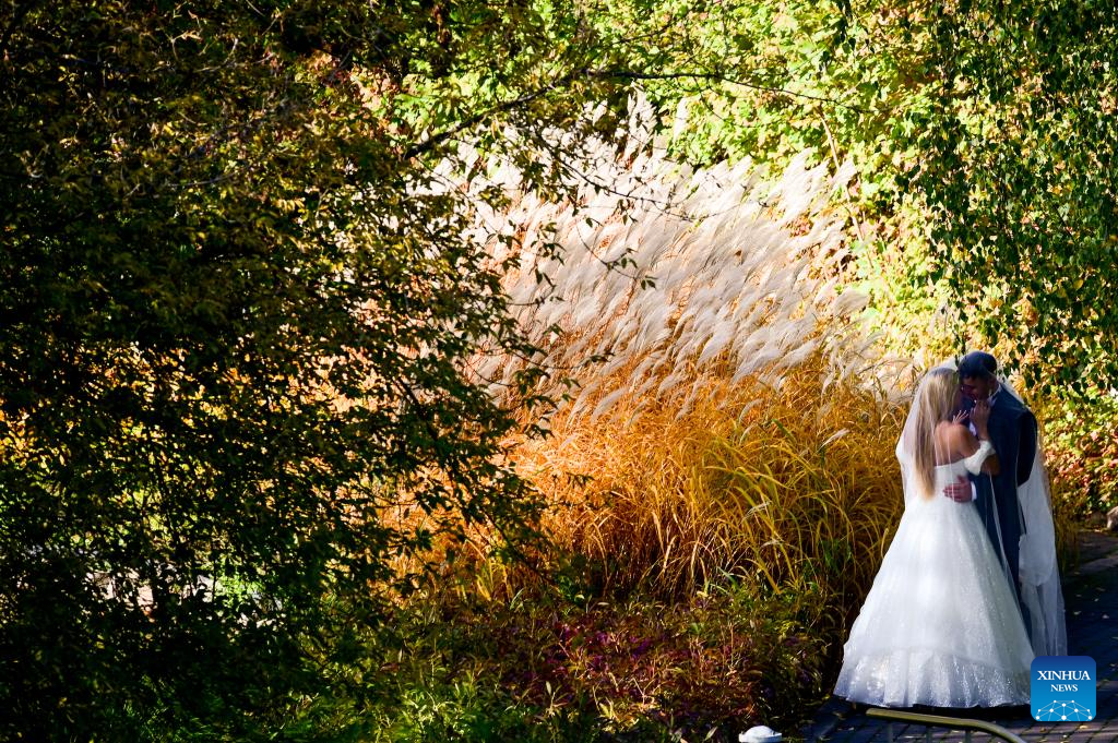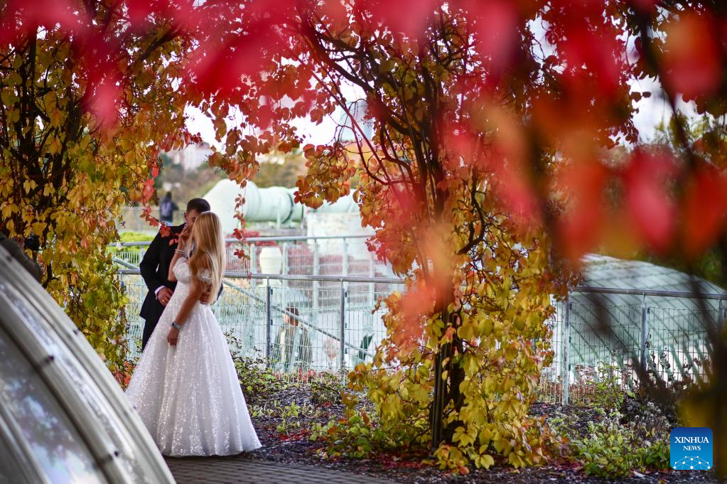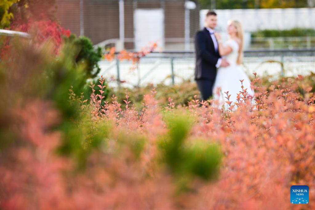 A couple takes wedding photos at the rooftop garden of the University of Warsaw in Warsaw, Poland on Oct. 13, 2025. In recent days, the garden's vegetation has taken on autumn colors, attracting many visitors. (Photo by Aleksy Witwicki/Xinhua)