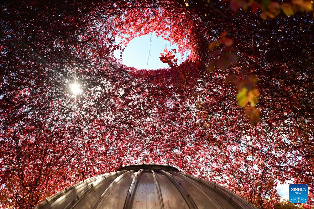 Sunlight shines through red autumn leaves at the rooftop garden of the University of Warsaw in Warsaw, Poland on Oct. 13, 2025. In recent days, the garden's vegetation has taken on autumn colors, attracting many visitors. (Photo by Aleksy Witwicki/Xinhua)
