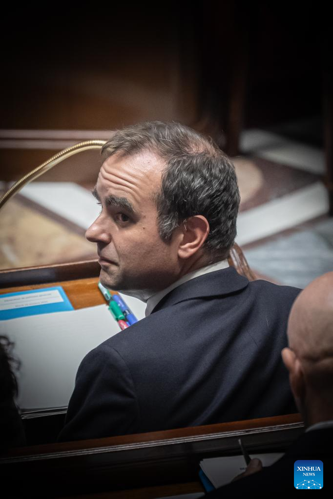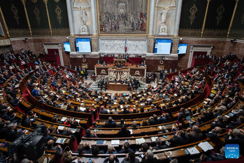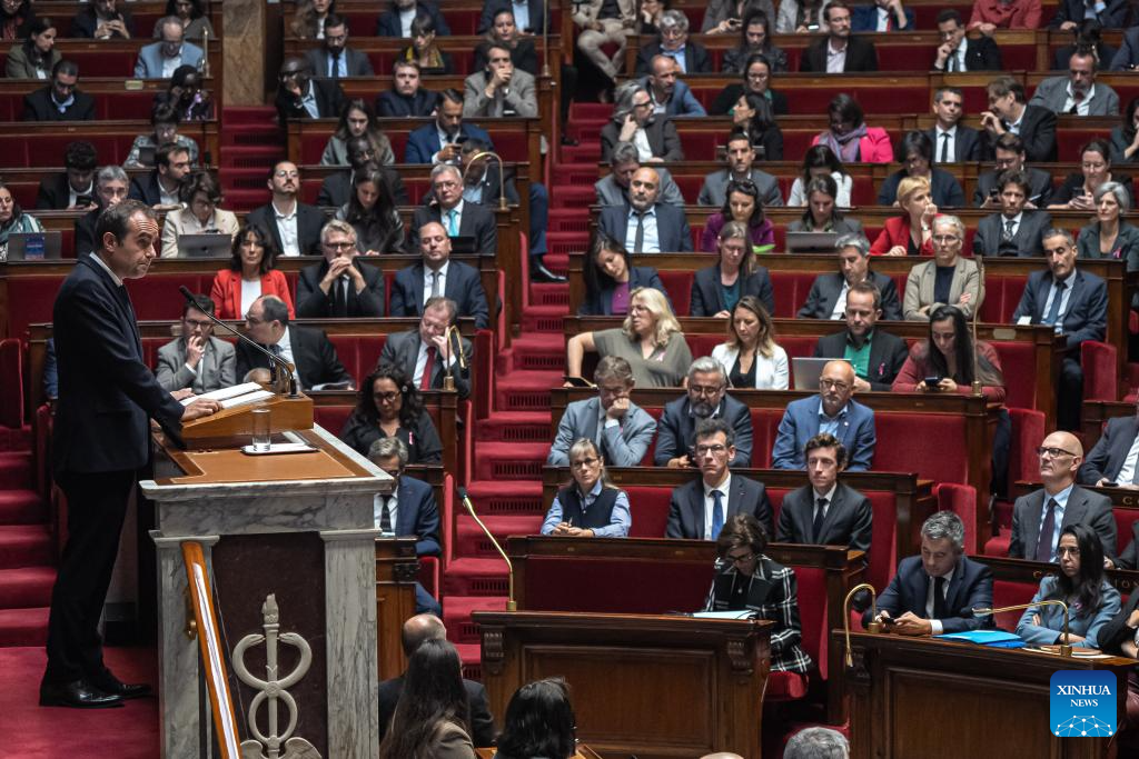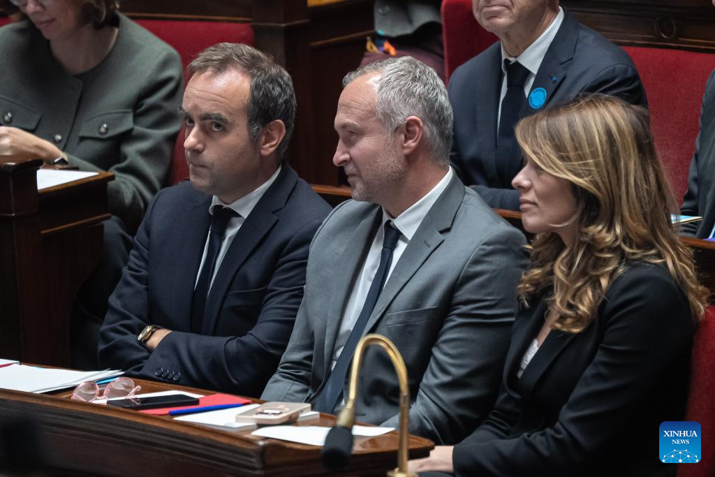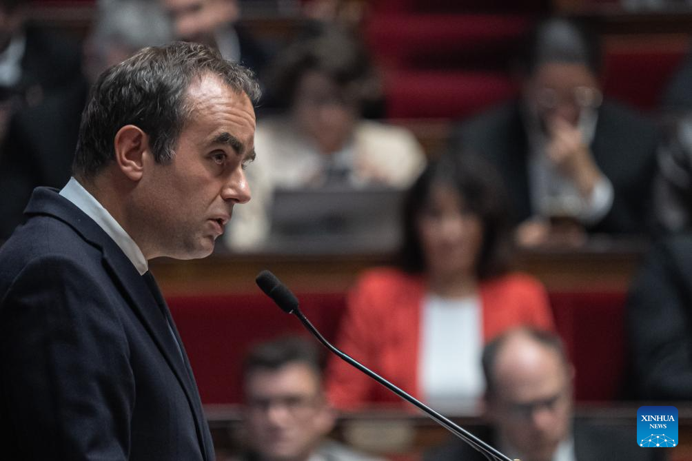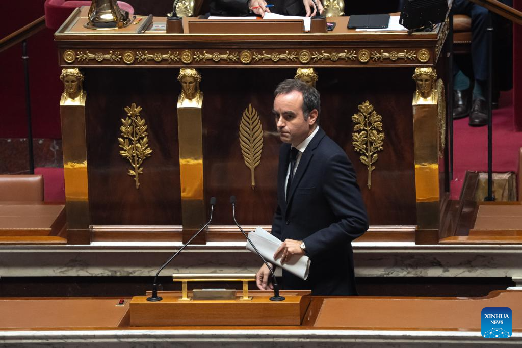 French Prime Minister Sebastien Lecornu delivers a policy speech at the National Assembly in Paris, France, Oct. 14, 2025. French Prime Minister (PM) Sebastien Lecornu on Tuesday announced the suspension of controversial pension reforms until the presidential election. The public deficit will be reduced to 4.7 percent of GDP in the draft budget for 2026 and must "in any case be less than 5 percent at the end of the discussion" in Parliament, Lecornu said. He also confirmed that he intends to maintain the target of 5.4 percent for 2025. (Photo by Aurelien Morissard/Xinhua)