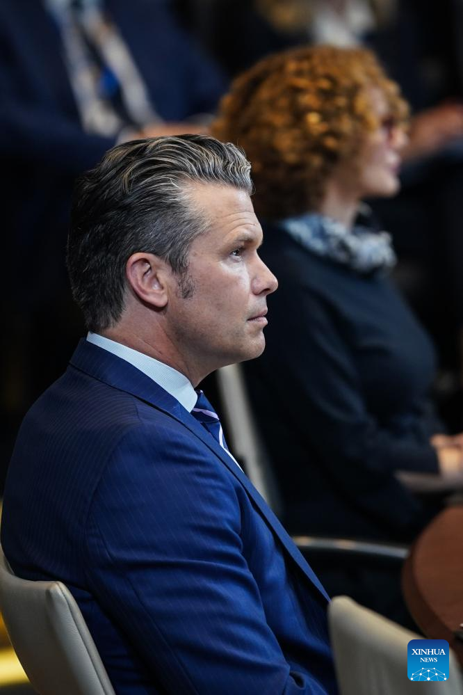 U.S. Defense Secretary Pete Hegseth attends NATO's defense ministers' meeting in Brussels, Belgium, Oct. 15, 2025. The flight carrying U.S. Defense Secretary Pete Hegseth landed at a military airport in Britain on Wednesday evening after declaring an emergency, according to aircraft surveillance platform ADS-B Exchange. The flight, SAM 153, was flying over the North Atlantic before turning back to Britain. The flight was en route back to the United States from NATO's defense ministers' meeting in Belgium, said Pentagon spokesperson Sean Parnell. (Xinhua/Peng Ziyang)