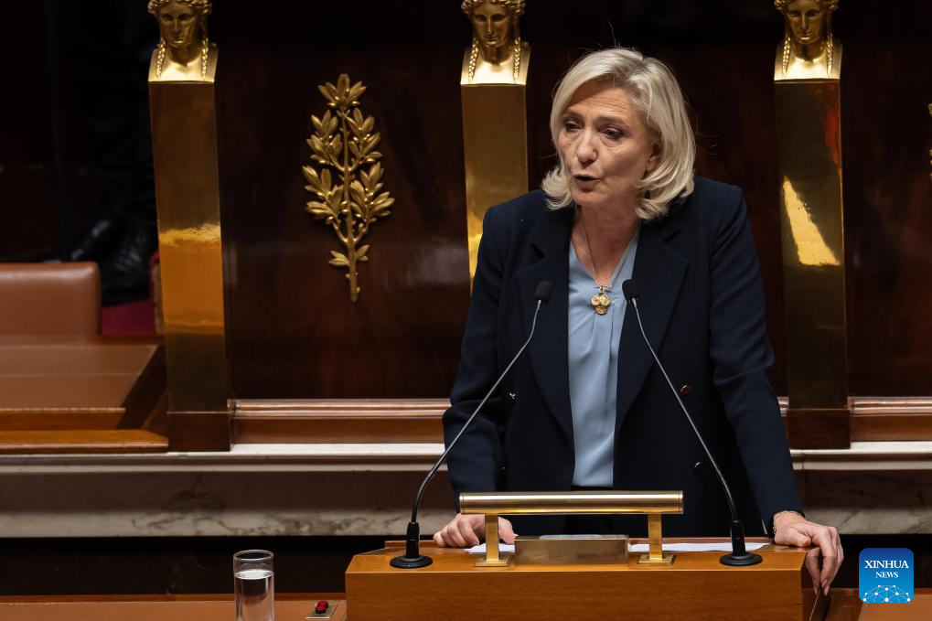 Marine Le Pen, leader of France's far-right wing party National Rally, delivers a speech during the debate on the no-confidence motion against the government at the National Assembly in Paris, France, Oct. 16, 2025. The French government led by Prime Minister Sebastien Lecornu survives two no-confidence motions in the National Assembly on Thursday, thus avoiding collapse in a particularly tense political climate. (Photo by Aurelien Morissard/Xinhua)