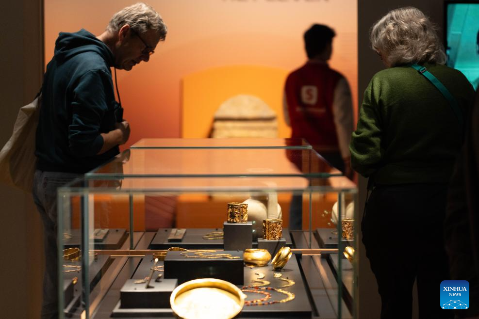 Visitors view exhibits during a media preview of the exhibition "Discovering Ancient Egypt" at the Rijksmuseum van Oudheden in Leiden, the Netherlands, Oct. 15, 2025. The exhibition, opening to the public on Thursday, showcases the life of ancient Egypt through 500 carefully curated artifacts. It will run until March 15, 2026. (Photo by Sylvia Lederer/Xinhua)