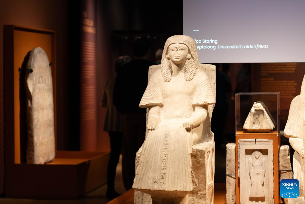 Artifacts are displayed during the media preview of the exhibition "Discovering Ancient Egypt" at the Rijksmuseum van Oudheden in Leiden, the Netherlands, Oct. 15, 2025. The exhibition, opening to the public on Thursday, showcases the life of ancient Egypt through 500 carefully curated artifacts. It will run until March 15, 2026. (Photo by Sylvia Lederer/Xinhua)